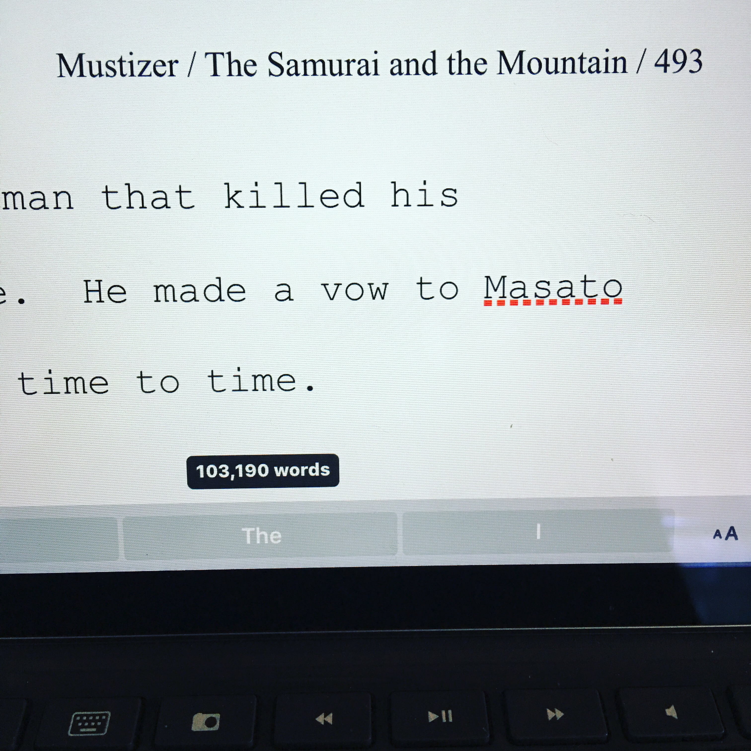 There it is. The final page of the rough draft of The Samurai and the Mountain. She’s going to be about 500 pages. And 103,000 words for now. That’s a decent average length for the novel. I’m glad the story fell into this range. At one point early on in the writing process, it was looking like it was going to be roughly 800 pages and I felt that was a bit hefty. But, once the backstories of everyone were in place, the story sort of fell in with less need for the already established depth.
