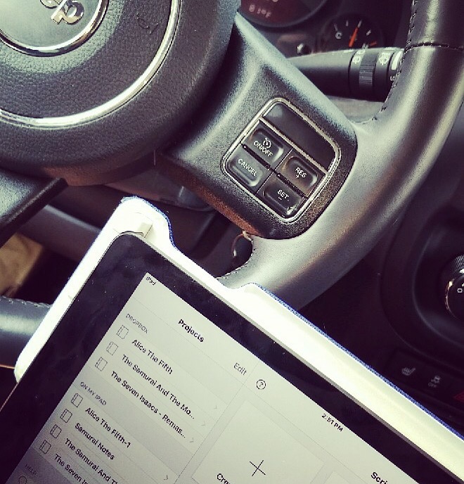 The great thing about being mobile with my workstation, which I realized today, that I have been working on a similarly mobile device for so many years. I would say it dates all the way back to 2002, back before tablets and smartphones and my own little cheap IBM workpad. It wasn't a thinkpad. That was something different. This was a sore excuse for a computer that I somehow managed to write screenplay after screenplay on use because it was portable. Just as I do now. Only now, fifteen years later, it's an ipad with a Logitech keyboard. I am also realizing that I may have to order a few back up keyboards as this one is taking quite a beating from my fast moving fingertips. Aaaanyway, here is a pic of me writing and working on a novel while waiting for the school bus to drop off the little one from summer rec.